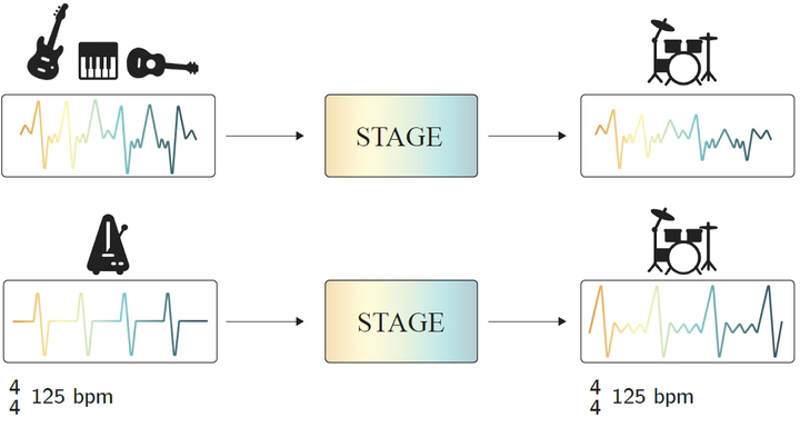 Recent advances in generative models have made it possible to create high-quality, coherent music, with some systems delivering production-level output. Yet, most existing models focus solely on generating music from scratch, limiting their usefulness for musicians who want to integrate such models into a human, iterative composition workflow. In this paper we introduce STAGE, our STemmed Accompaniment GEneration model, fine-tuned from the state-of-the-art MusicGen to generate single-stem instrumental accompaniments conditioned on a given mixture. Inspired by instruction-tuning methods for language models, we extend the transformer’s embedding matrix with a context token, enabling the model to attend to a musical context through prefix-based conditioning. Compared to the baselines, STAGE yields accompaniments that exhibit stronger coherence with the input mixture, higher audio quality, and closer alignment with textual prompts. Moreover, by conditioning on a metronome-like track, our framework naturally supports tempo-constrained generation, achieving state-of-the-art alignment with the target rhythmic structure–all without requiring any additional tempo-specific module. As a result, STAGE offers a practical, versatile tool for interactive music creation that can be readily adopted by musicians in real-world workflows.
