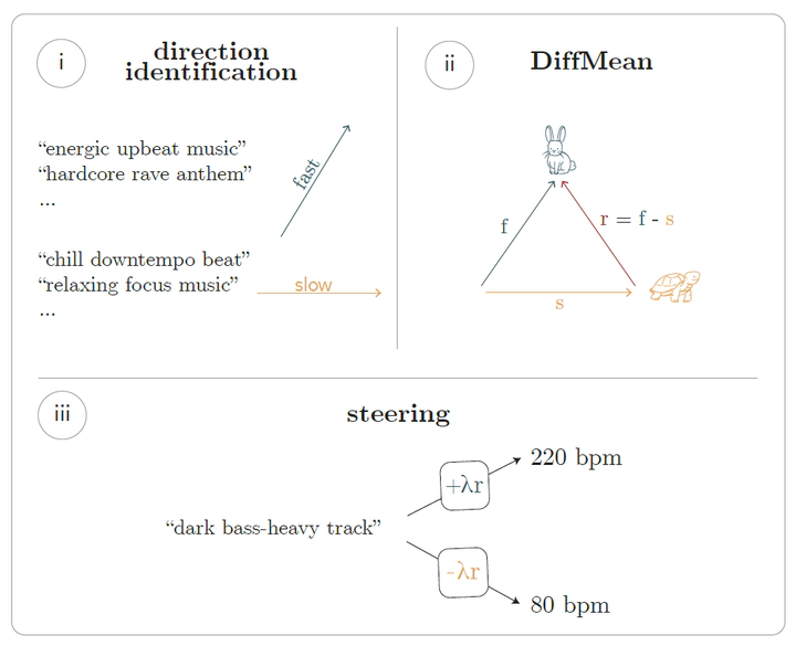 Understanding how large audio models represent music, and using that understanding to steer generation, is both challenging and underexplored. Inspired by mechanistic interpretability in language models, where direction vectors in transformer residual streams are key to model analysis and control, we investigate similar techniques in the audio domain. This paper presents the first study of latent direction vectors in large audio models and their use for continuous control of musical attributes in text-to-music generation. Focusing on binary concepts like tempo (fast vs. slow) and timbre (bright vs. dark), we compute steering vectors using the difference-in-means method on curated prompt sets. These vectors, scaled by a coefficient and injected into intermediate activations, allow fine-grained modulation of specific musical traits while preserving overall audio quality. We analyze the effect of steering strength, compare injection strategies, and identify layers with the greatest influence. Our findings highlight the promise of direction-based steering as a more mechanistic and interpretable approach to controllable music generation.