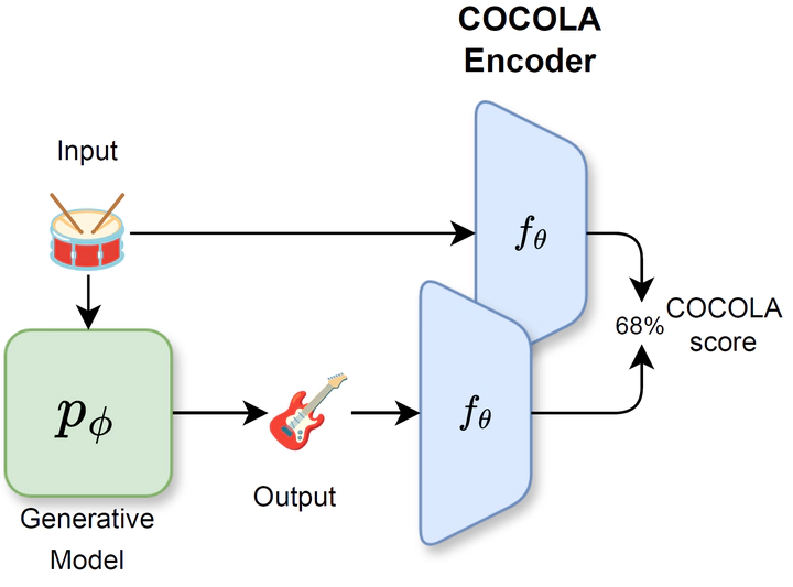 We present COCOLA (Coherence-Oriented Contrastive Learning for Audio), a contrastive learning method for musical audio representations that captures the harmonic and rhythmic coherence between samples. Our method operates at the level of stems (or their combinations) composing music tracks and allows the objective evaluation of compositional models for music in the task of accompaniment generation. We also introduce a new baseline for compositional music generation called CompoNet, based on ControlNet, generalizing the tasks of MSDM, and quantify it against the latter using COCOLA. We release all models trained on public datasets containing separate stems (MUSDB18-HQ, MoisesDB, Slakh2100, and CocoChorales).