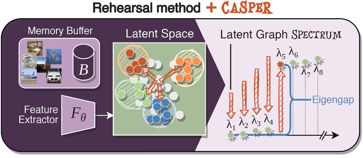 While biological intelligence grows organically as new knowledge is gathered throughout life, Artificial Neural Networks forget catastrophically whenever they face a changing training data distribution. Rehearsal-based Continual Learning (CL) approaches have been established as a versatile and reliable solution to overcome this limitation; however, sudden input disruptions and memory constraints are known to alter the consistency of their predictions. We study this phenomenon by investigating the geometric characteristics of the learner’s latent space and find that replayed data points of different classes increasingly mix up, interfering with classification. Hence, we propose a geometric regularizer that enforces weak requirements on the Laplacian spectrum of the latent space, promoting a partitioning behavior. Our proposal, called Continual Spectral Regularizer for Incremental Learning (CaSpeR-IL), can be easily combined with any rehearsal-based CL approach and improves the performance of SOTA methods on standard benchmarks.