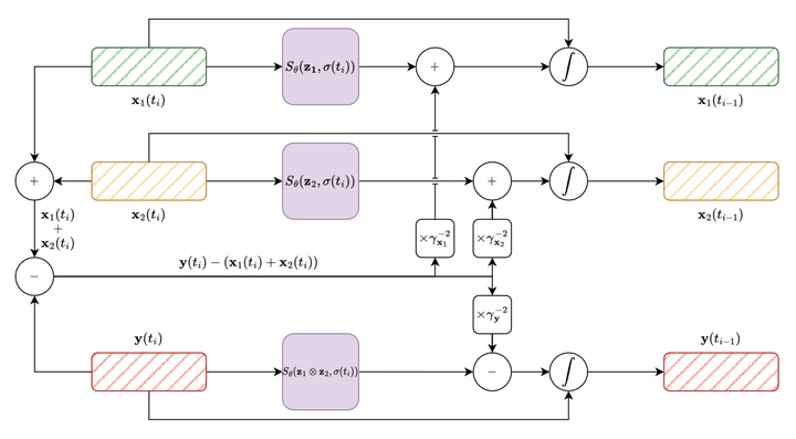 Multi-Source Diffusion Models (MSDM) allow for compositional musical generation tasks: generating a set of coherent sources, creating accompaniments, and performing source separation. Despite their versatility, they require estimating the joint distribution over the sources, necessitating pre-separated musical data, which is rarely available, and fixing the number and type of sources at training time. This paper generalizes MSDM to arbitrary time-domain diffusion models conditioned on text embeddings. These models do not require separated data as they are trained on mixtures, can parameterize an arbitrary number of sources, and allow for rich semantic control. We propose an inference procedure enabling the coherent generation of sources and accompaniments. Additionally, we adapt the Dirac separator of MSDM to perform source separation. We experiment with diffusion models trained on Slakh2100 and MTG-Jamendo, showcasing competitive generation and separation results in a relaxed data setting.