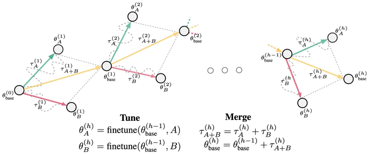 Model merging has recently emerged as a cost-efficient paradigm for multi-task learning. Among current approaches, task arithmetic stands out for its simplicity and effectiveness. In this paper, we motivate the effectiveness of task vectors by linking them to multi-task gradients. We show that in a single-epoch scenario, task vectors are mathematically equivalent to the gradients obtained via gradient descent in a multi-task setting, and still approximate these gradients in subsequent epochs. Furthermore, we show that task vectors perform optimally when equality is maintained, and their effectiveness is largely driven by the first epoch’s gradient. Building on this insight, we propose viewing model merging as a single step in an iterative process that Alternates between Tuning and Merging (ATM). This method acts as a bridge between model merging and multi-task gradient descent, achieving state-of-the-art results with the same data and computational requirements. We extensively evaluate ATM across diverse settings, achieving up to 20% higher accuracy in computer vision and NLP tasks, compared to the best baselines. Finally, we provide both empirical and theoretical support for its effectiveness, demonstrating increased orthogonality between task vectors and proving that ATM minimizes an upper bound on the loss obtained by jointly finetuning all tasks.